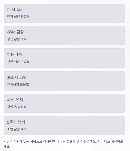 “한 달 후기”, “-7kg 감량”, “허용식품 리스트”,