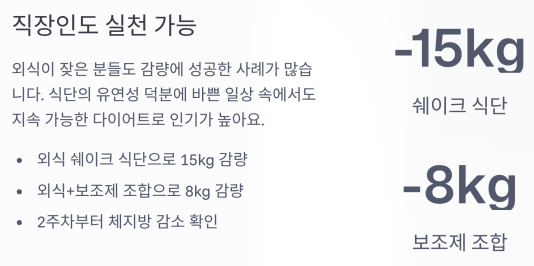“외식 식단 셰이크로 15kg 감량” 같은 경험담도 있어요.