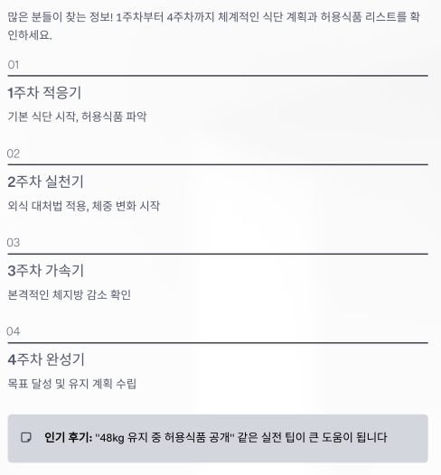 후기 중에는 “식단 1주 차~4주 차 총정리”, “허용식품 리스트”가