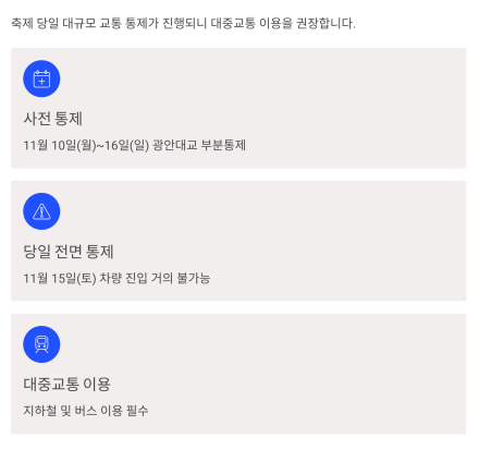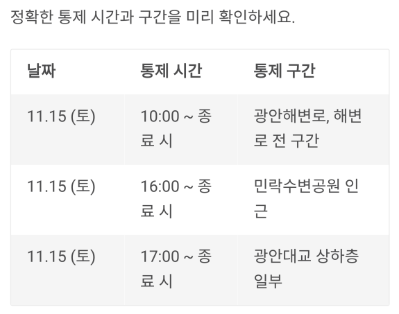 | 11.15 (토) | 10:00 ~ 종료 시 | 광안해변로, 해변로 전 구간 |