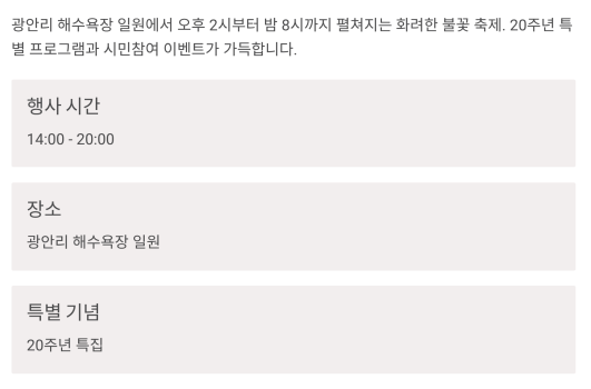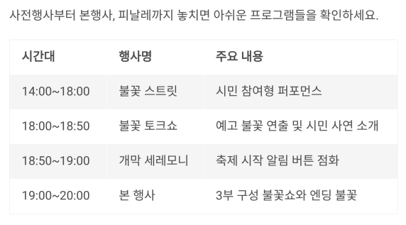 | 19:00~20:00 | 본 행사 | 3부 구성 불꽃쇼와 엔딩 불꽃 |