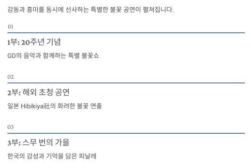 올해 불꽃쇼는 3부 구성으로 무대를 나눠 감동과 흥미를 동시에 선사합니다.