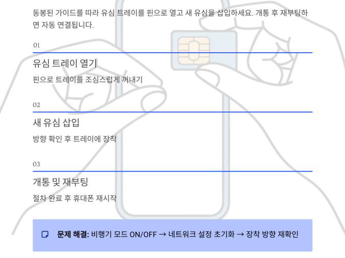 동봉된 가이드에 따라 유심 트레이를 핀으로 열고 새 유심을 삽입해 주세요.