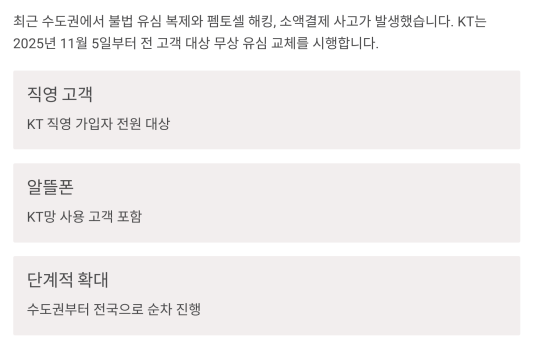 이번 무상 교체 대상은 2025년 9월 4일 기준 KT 무선 회선을 이용 중인 고객입니다.