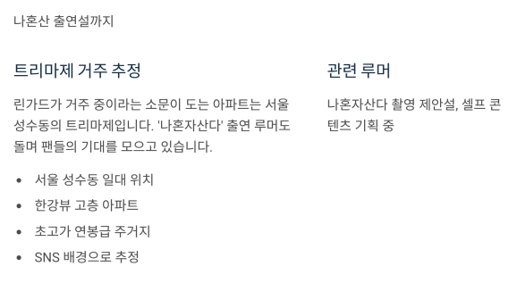 | 관련 루머 | 나혼자산다 촬영 제안설, 셀프 콘텐츠 기획 중 |