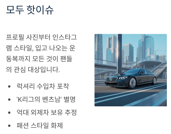 특히 최근 공개된 럭셔리 수입차와 함께 포착된 사진은 'K리그의 벤츠남'이라는 별명을 만들어내기도 했습니다.