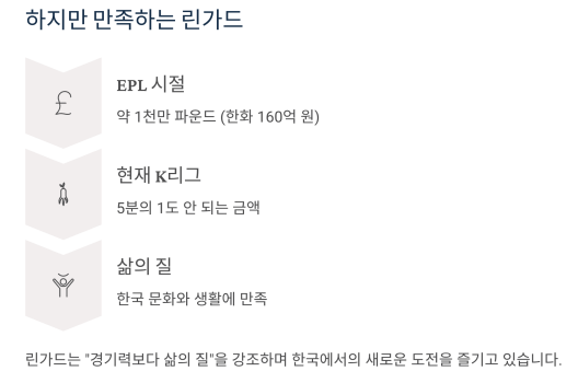 하지만 린가드는 “경기력보다 삶의 질”을 강조하며 한국 문화와 생활에 만족하는 모습을 보여주고 있습니다.
