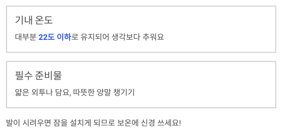 기내 온도는 대부분 22도 이하로 유지되기 때문에 얇은 외투나 담요는 꼭 챙기는 것이 좋아요.