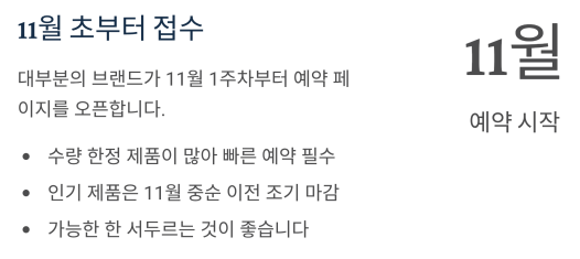 일정은 브랜드마다 다르지만 보통 11월 1주 차부터 예약 페이지가 오픈되며,