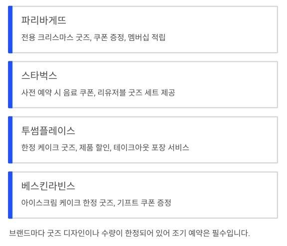| 파리바게뜨 | 전용 크리스마스 굿즈, 쿠폰 증정, 멤버십 적립 |