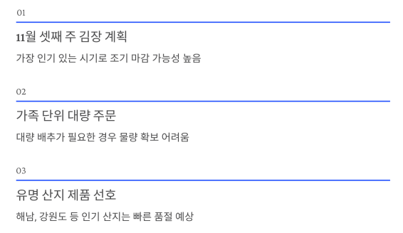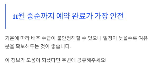 12월 김장을 계획하고 있다면, 11월 중순까지는 예약을 마치는 것이 가장 안전합니다.