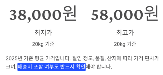 2025년 기준, 평균 가격은 20kg 기준으로 약 38,000원~58,000원대.