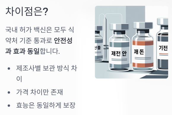 국내에서 허가된 백신은 모두 식약처 기준을 통과했기 때문에 안전성과 효과는 동일하다고 볼 수 있습니다.