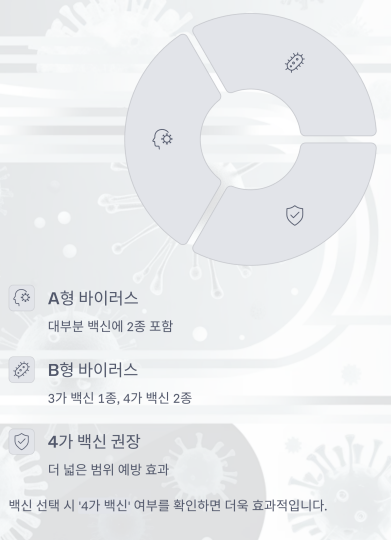 대부분의 백신은 3가 또는 4가 백신으로 A형 2종 + B형 1~2종을 포함하고 있어 보다 넓은 범위로 감염을 예방합니다.