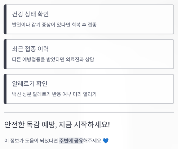 또한 알레르기 반응이 있었던 분들은 백신 성분을 확인하고 의료진에게 미리 알려야 해요.