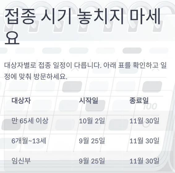 대상자별 접종 일정은 순차적으로 다릅니다. 시기를 놓치지 않도록 표로 정리해 드릴게요.