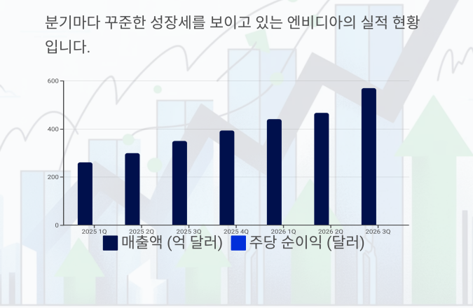 아래의 표에서 확인할 수 있듯이 엔비디아는 분기마다 꾸준한 실적 성장을 보이고 있습니다.