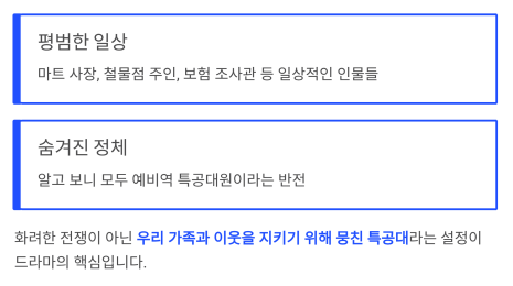 인물들이 알고 보니 예비역 특공대였다는 반전이 드라마의 큰 재미 요소입니다.