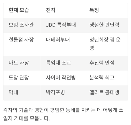 보험 조사관은 JDD 특작부대 출신, 철물점 주인은 대테러부대, 마트 사장님은