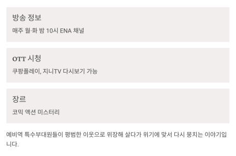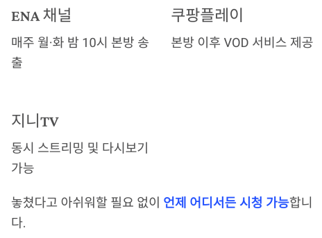 | ENA 채널 | 매주 월·화 밤 10시 본방 |