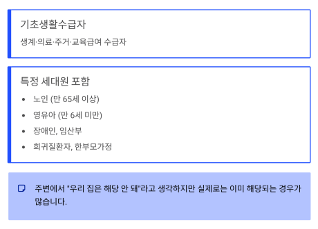 노인, 영유아, 장애인, 임산부, 희귀 질환자, 한부모가정 등이 있다면 자동으로 자격이 부여될 수 있어요.
