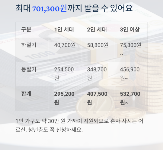 1인 가구라도 약 30만 원 가까이 지원되는 만큼