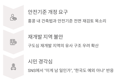 이번 화재는 단순한 사고를 넘어 홍콩 내 안전기준과 건축법 개정 요구로 이어지고 있습니다.