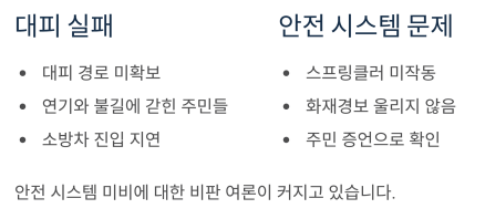 피해 규모와 사망자 수, 구조 지연, 그리고 안전 시스템 미비 등