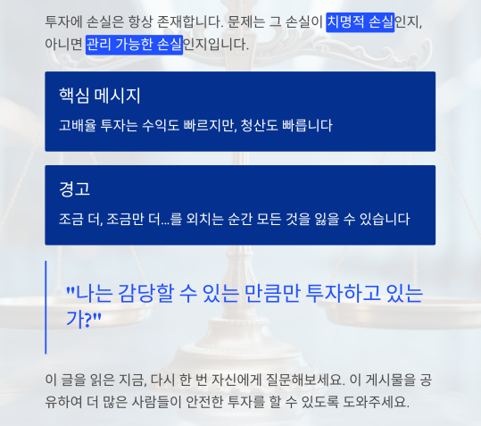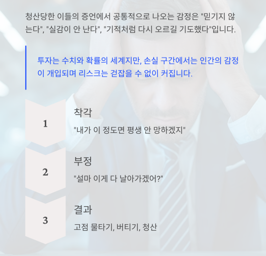이러한 심리가 바로 고점 물타기, 버티기, 그리고 결국 청산으로 이어집니다.