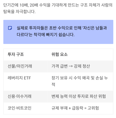 | 레버리지 ETF | 장기 보유 시 수익 왜곡 및 손실 누적 |
