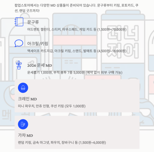 문구류부터 키링, 포토카드, 쿠션, 랜덤 굿즈까지!