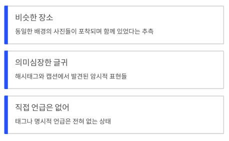 비슷한 장소에서의 사진, 의미심장한 글귀, 해시태그 등을
