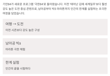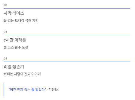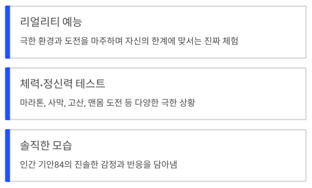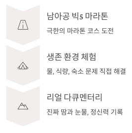 | 주제 | 인간의 한계 도전, 마라톤, 사막 체험 등 |