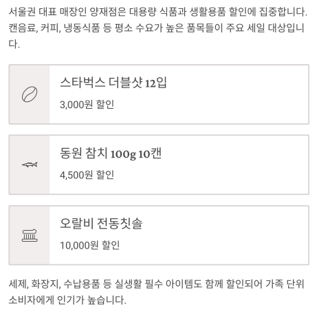 양재점: 대용량 식품과 인기 생활용품 집중 할인
