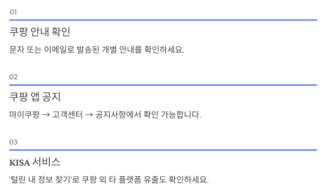 한국인터넷진흥원에서 운영하는 플랫폼으로, - 쿠팡뿐 아니라 타 플랫폼에서의 유출 여부까지도 확인할 수 있습니다.