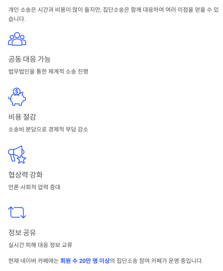 현재 네이버 카페에는 다양한 집단소송 참여 카페가 운영 중이며,