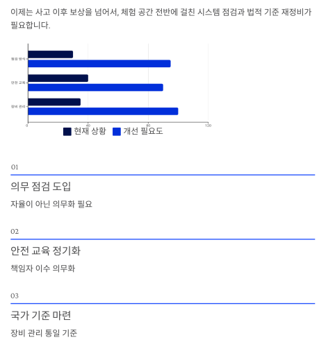 체험 공간 전반에 걸친 시스템 점검과 법적 기준 재정비가 필요합니다.