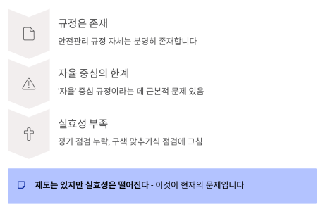 | 점검 방식 | 자율 점검 중심 | 의무화 필요 |