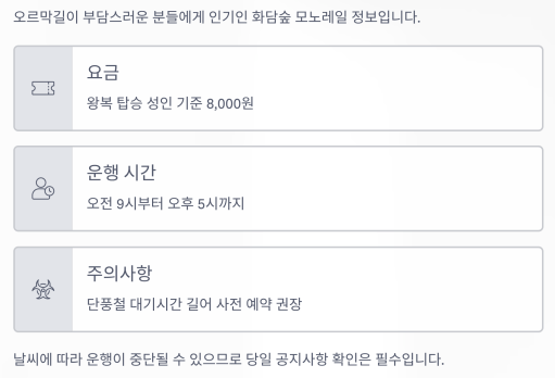 | 유의사항 | 단풍철엔 대기시간 길어 사전 예약 권장 |