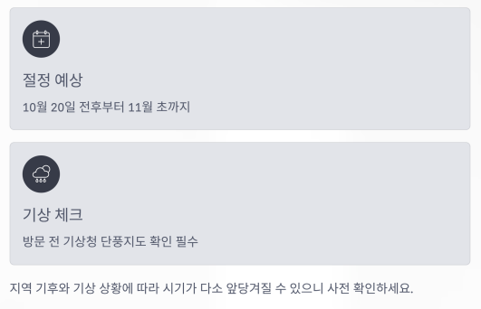 지역 기후와 기상 상황에 따라 다소 앞당겨질 수 있으니, 방문 전 기상청 단풍지도 체크는 필수입니다.