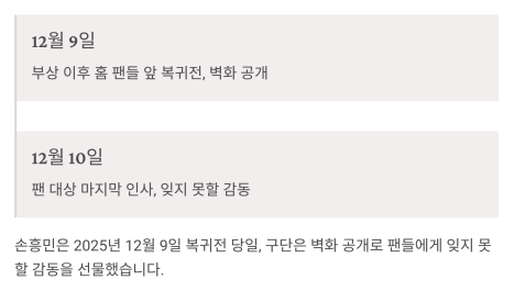 손흥민은 2025년 12월 9일, 부상 이후 오랜만에 홈 팬들 앞에 복귀했습니다.