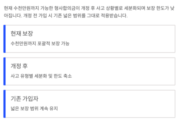개정 후에는 사고 상황별로 세분화되며, 보장 한도 자체가 낮아질 가능성이 높습니다.