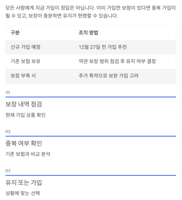 | 기존 보험 보유 | 약관 보장 범위 점검 후 유지 여부 결정 |