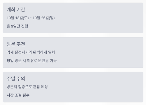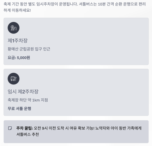 | 임시 제2주차장 | 축제장 하단 약 1km 지점 | 무료 셔틀 운행 |