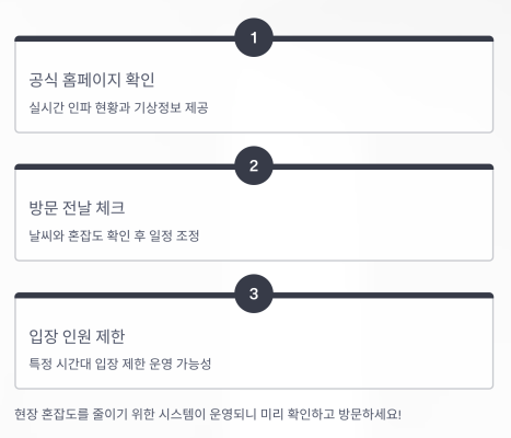 현장 혼잡도를 줄이기 위해 입장 인원 제한 시간대도 운영되니 참고하세요.
