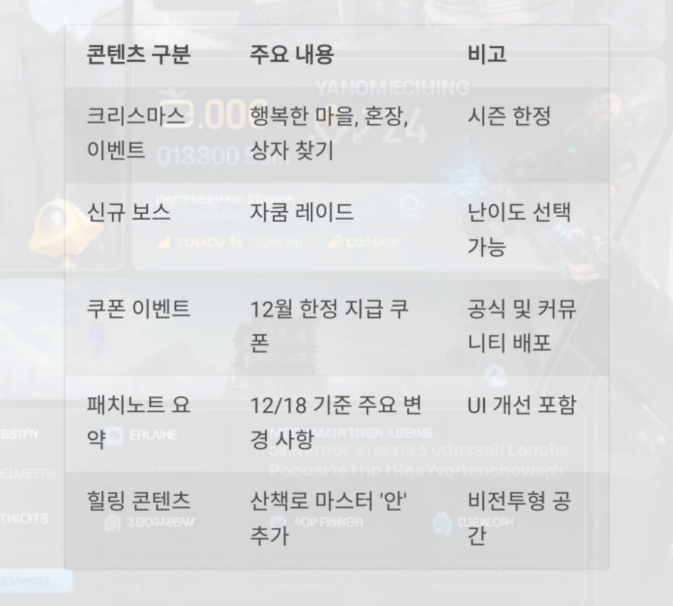 | 쿠폰 이벤트 | 12월 한정 지급 쿠폰 | 공식 및 커뮤니티 배포 |