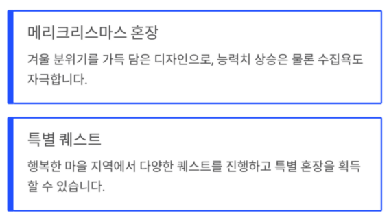 | 크리스마스 이벤트 | 행복한 마을, 혼장, 상자 찾기 | 시즌 한정 |