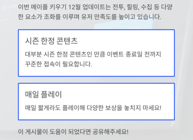 이번 메이플 키우기 12월 업데이트는 전투, 힐링, 수집 등