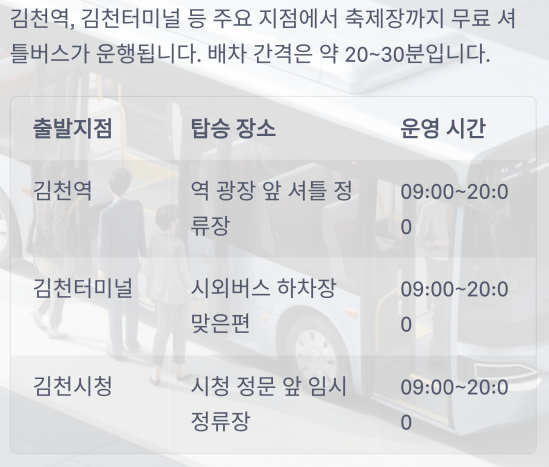 김천역, 김천터미널 등 주요 지점에서 축제장까지 셔틀버스가 무료로 운행됩니다.