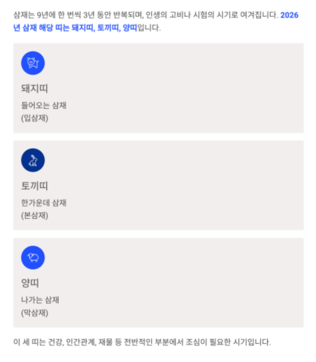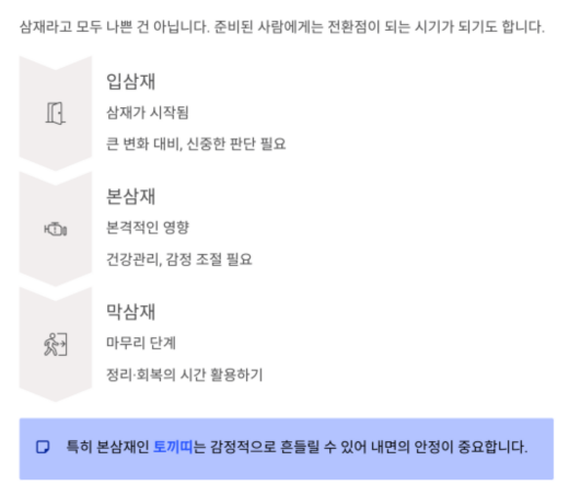 | 입삼재 | 삼재가 시작됨 | 큰 변화 대비, 신중한 판단 |